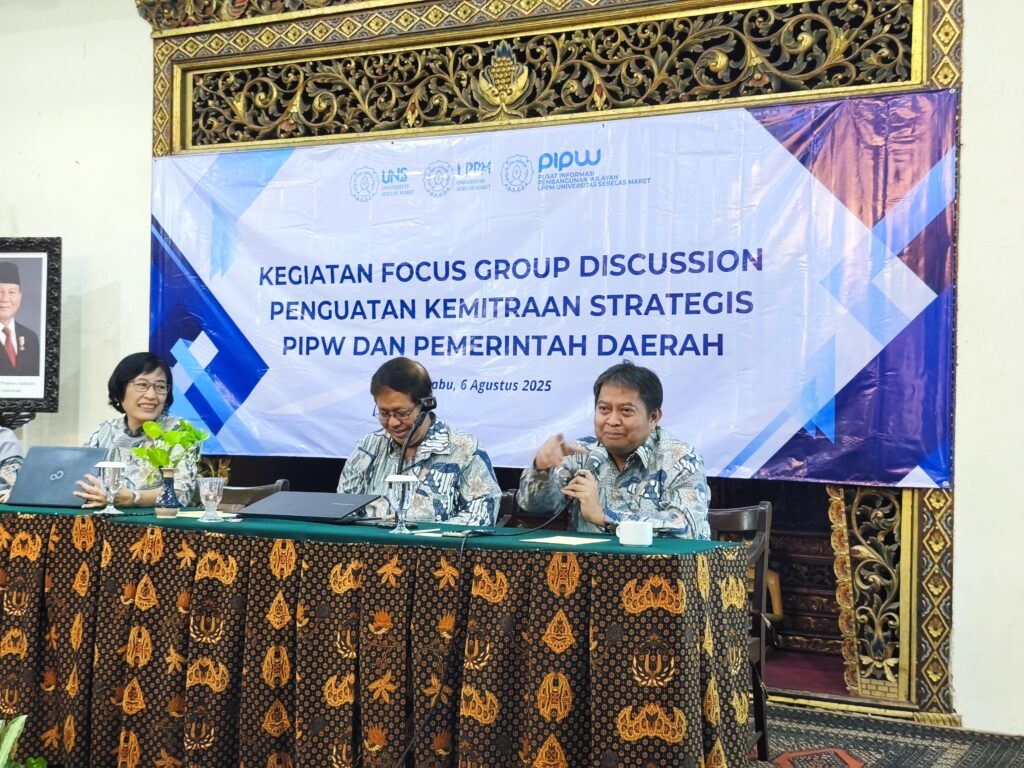 Pada hari Rabu, 6 Agustus 2025 Pusat Informasi Pembangunan Wilayah (PIPW) Lembaga Penelitian dan Pengabdian kepada Masyarakat (LPPM) Universitas Sebelas Maret (UNS) menyelenggarakan Focus Group Discussion (FGD) berjudul “Penguatan Kemitraan Strategis PIPW dan Pemerintah Daerah” yang dihadiri oleh perwakilan pemerintah daerah wilayah Subosukawonosraten.